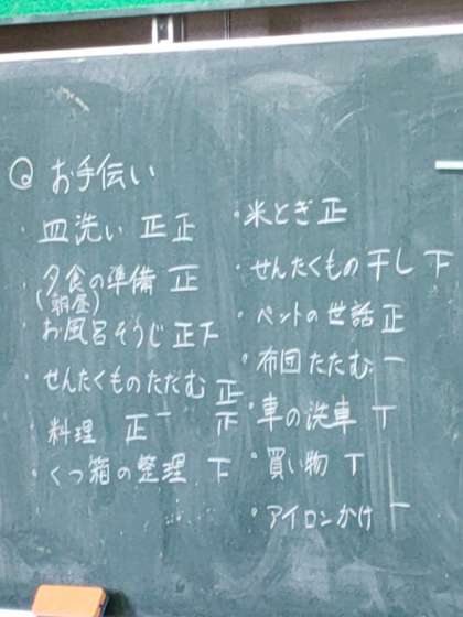 そして、家庭科は家庭生活をより良くしていくことに目的があるので、家でどんなお手伝いをしているのかを全員発表していきました^_^