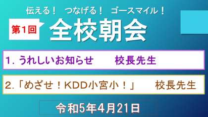 そこで、第1回目の伝えるは、校長から子どもたちに「KDD小宮小!」について話をしました。