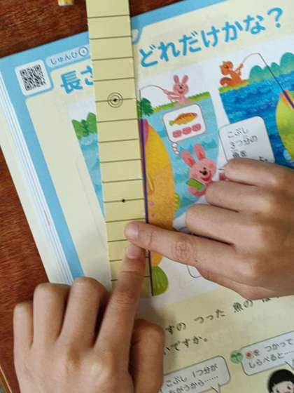 授業では、教科書の巻末についているオリジナルものさしを取り出して、それを使って魚の長さを測りました。