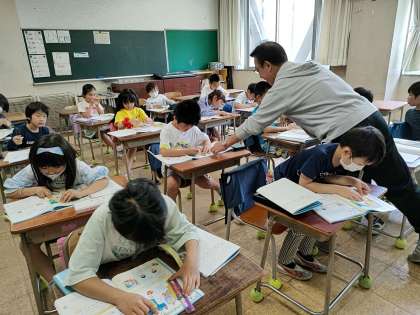 3クラスを4つのグループに分けて、そのうちの1つのグループの授業では、教科書の挿絵として、2つの大きさの違う魚の絵をもとにどちらが長いのかを考えるところから始まりました。