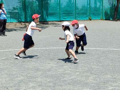 今日のクラスでは、しっぽ取りゲームを行っていました。しかしただのしっぽ取りではありません。円の中に各チームから一人ずつ入り、しっぽ取りをします。しっぽをとられたら外に出ます。とられなかったらそのまま円の中で取り合います。制限時間は20秒です。20秒経ったら、次の人と交代します。