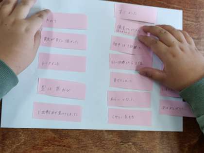 そこで、先生がその子の一言を取り上げて付箋に書き、その子はその付箋を組み合わせて文章を作っていきました。