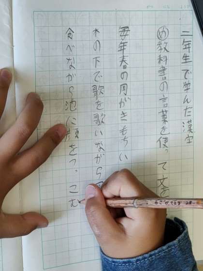 そこで、今日は復習です。復習は教科書に紹介されている漢字を使って、文章を作ってみるという学習です。