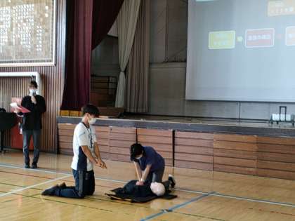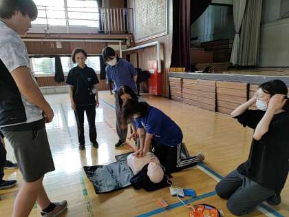 あってはならないことですが、水泳中に児童が何らかの原因で呼吸がなくなるようなことが起きた場合は、真っ先に教職員が、その児童を助けるために心肺蘇生を行います。