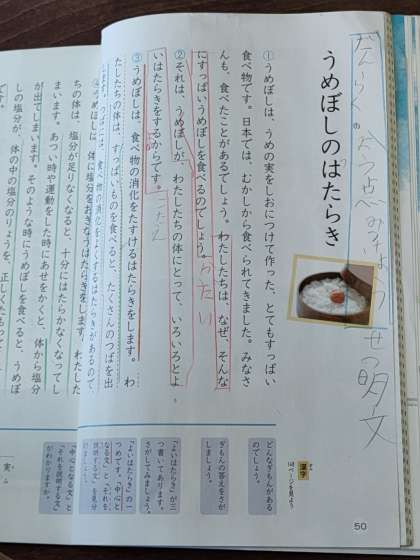 そこで授業では、子どもたちは鉛筆を持ち、お友達が教科書の文章を読むのを聞きながら、梅干しの働きについてわかるところに線を引いていきました^_^