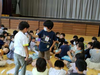今日はまず、がっこうたんけんのはじめの会がありました。司会の2年生の子どもたちのりっぱなあいさつの後で、2年生が1年生のために作ったバッジをプレゼントしてくれました。