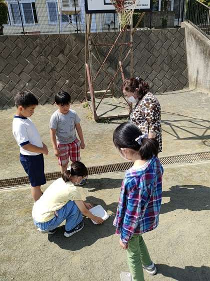 今日は、校庭の水が流れたあとを教材に、どこからどこへと流れたのかを調べました。