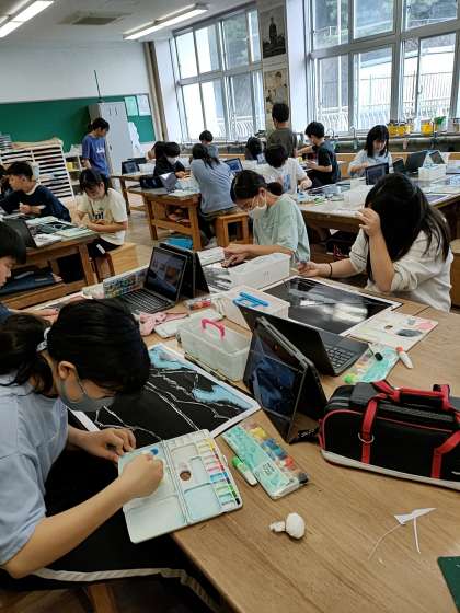 でも、子どもたちは急いでいても色にはこだわっていて、もととなる写真や絵の富士山の色を作るのに、いろいろな色を混ぜて、「これでいいかな‥。うーん。もう少し緑を入れてみよう‥。」と試行錯誤を繰り返していました。