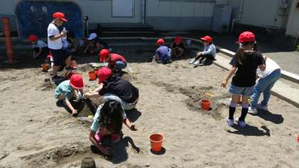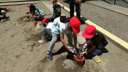 植木鉢やプリンカップを使って形作ったり、友だちと協力して大きな山を作ったり、深ーい穴を掘ったり…何時間でも楽しんでいられそうでした!