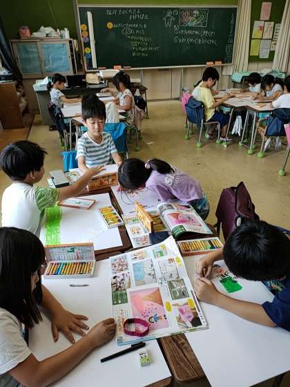 2年生は、図工で「たのしかったよ ドキドキしたよ」と題して、遠足の思い出を絵に書くことにしました。
