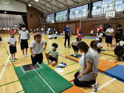 そしてそれぞれの種目では、反復横跳びを6年生が1年生に実演してみせたり、上体起こしのときに、足を持ってあげたりと本当に尽くしていました。
