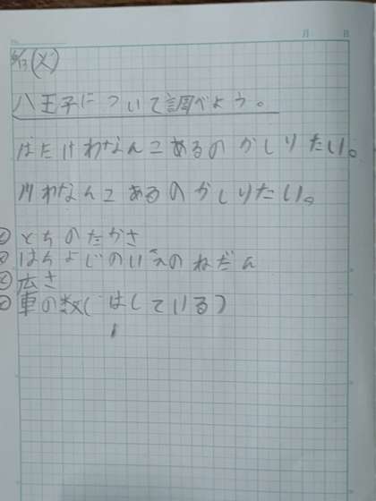 まず、子どもたちは八王子市の何を調べたいのかを考えてノートに書きました。
