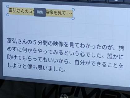 子どもたちは、この星野さんの生き方について、自分の考えをタブレット端末に入力して、発表していきました。