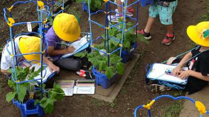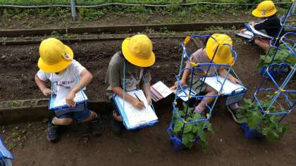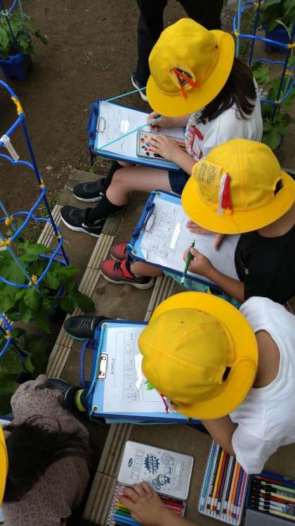 大事に育てているあさがおです。葉っぱが大きくなり、数も増えてきました。そして…何か変わったところがあるようです。今日はその様子を観察してカードに絵と文で記録しました。