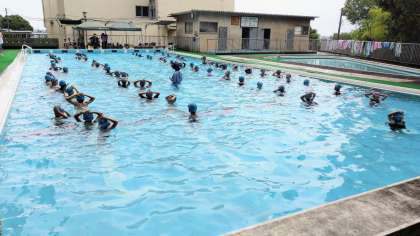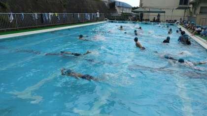 プールサイドでは、これからお世話になるプールにあいさつ。バディを確認、準備運動のあとシャワーです。冷たいシャワーを浴びると、プールの水があたたかく感じます。これも学校プールならでは…ですね。