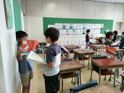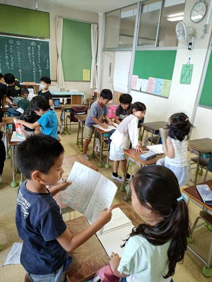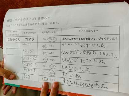 今日の1つのクラスでは、生きものクイズが完成して、お友達と作った問題を出し合う学習活動をしていました。