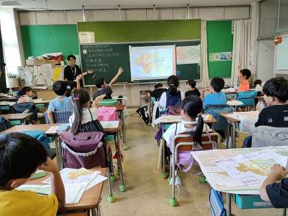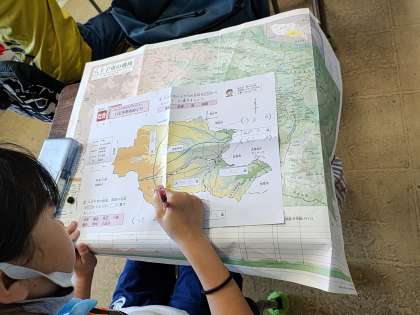 子どもたちは、八王子市の大きな地図を机いっぱいに広げ、その中から大きな道路と鉄道を見つけました。