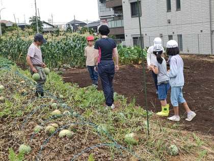 今日は、小宮小農園の方のご厚意で、すいかの収穫を4年生の1つのクラスがさせていただきました。