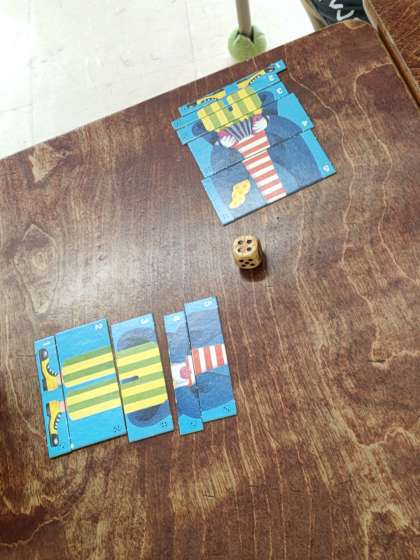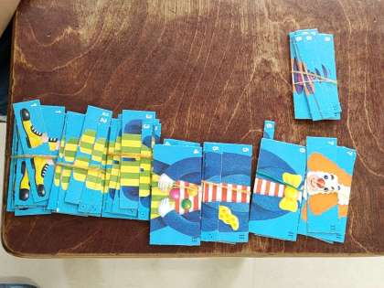 これはピエロの体のパーツがいくつも用意されており、サイコロを振って、そのサイコロの目と同じカードをひきます。