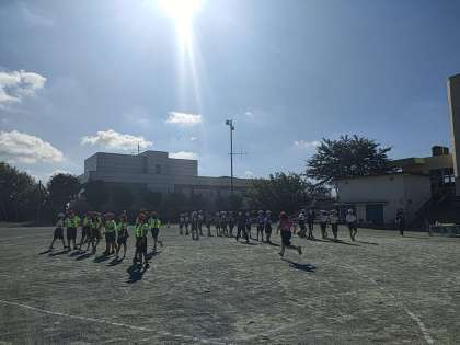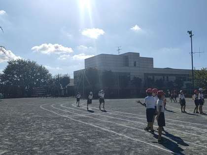今日は朝の涼しい時間帯をねらって(それでも暑いですが‥)、4年生がリレーの練習をしていました。
