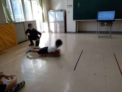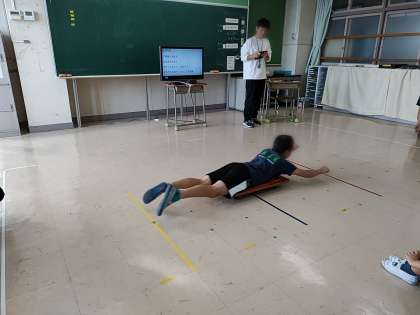 子どもたちは、目標の場所を通り越したり、届かなかったりしましたが、何度かするうちに、力を入れる入れたり加減したりしながら、目標のところまで行けるようになりました。
