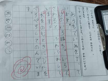 見てもらって、先生から少し直しが入ったり、お花マルがついたりしました。