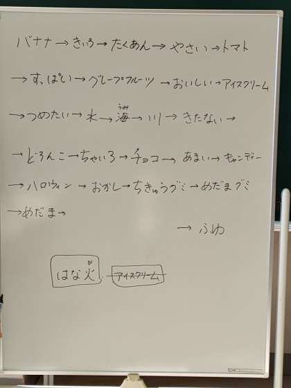 これはなかなか難しい!チェックポイントも「アイスクリーム」は「おいしい」からつながったのですが、一つの「花火」につながる言葉がなかなか出てきません。