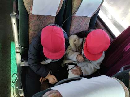 バスの中は、子どもたちの考えた浅草クイズをみんなで考えています。