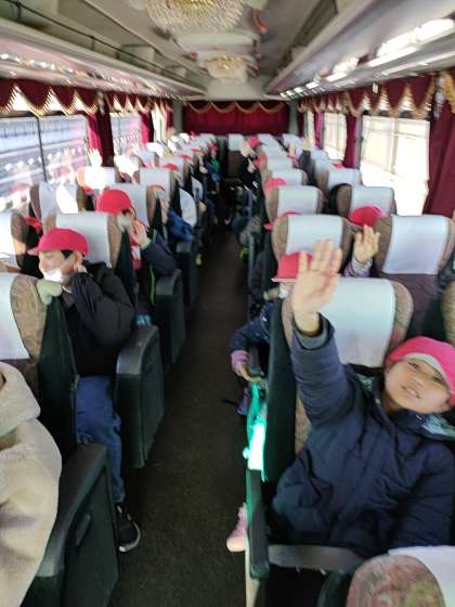 4年生のバスは、今、府中の競馬場を越えたところです。