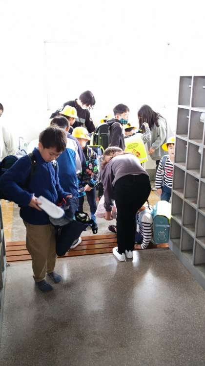 (1年生の昇降口には6年生や先生たちが出迎えてサポートします)