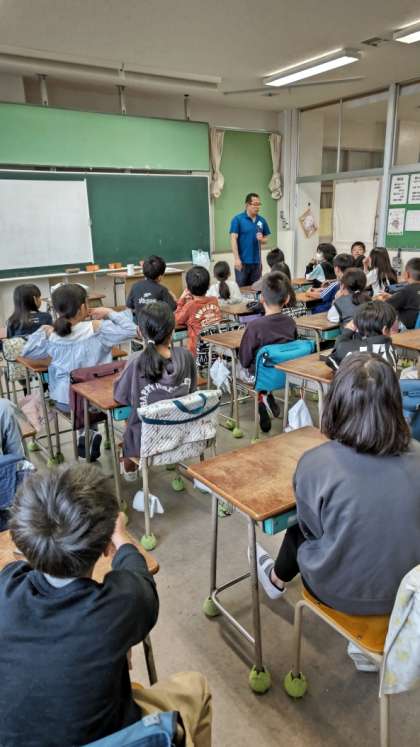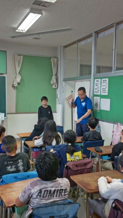 [4年生学活]先生が実際にほうきを持ちながら、掃除の進め方を説明しています。小宮小は1時間目の前に掃除があるんですね。