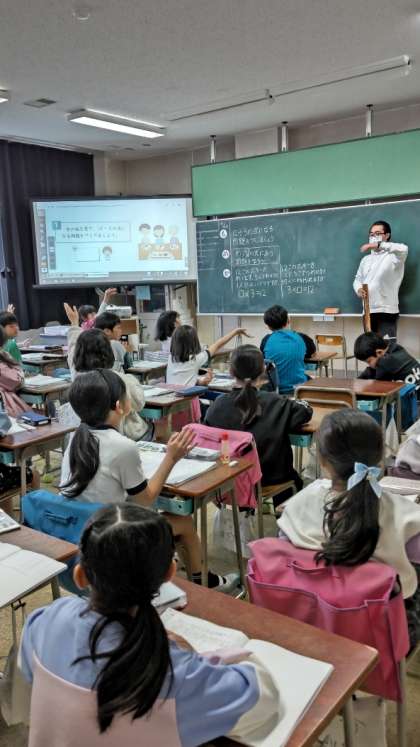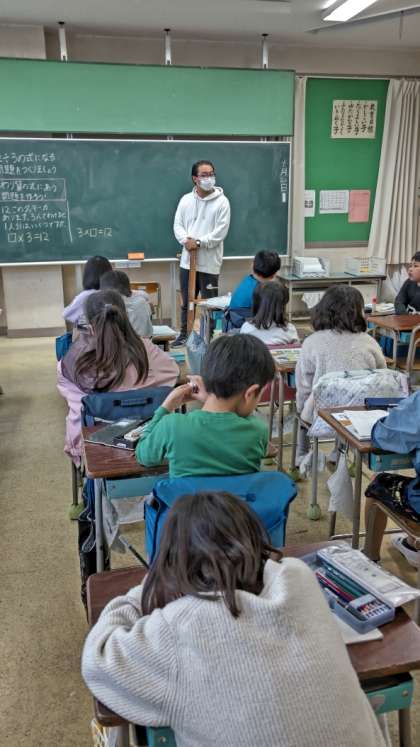 3年生の算数は「わり算」の学習です。今日は「12÷3の式になる問題をつくりましょう」というめあてです。