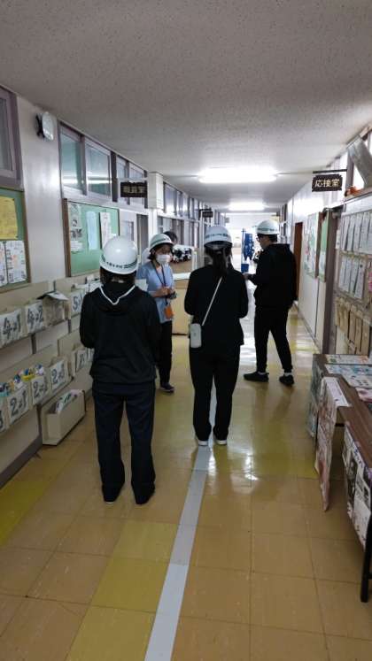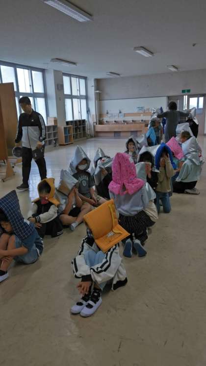 (今日は雨ですから、オープンスペースまでの避難と整列でした。先生たちは職員室へ人数報告に走ります)