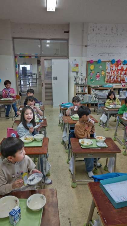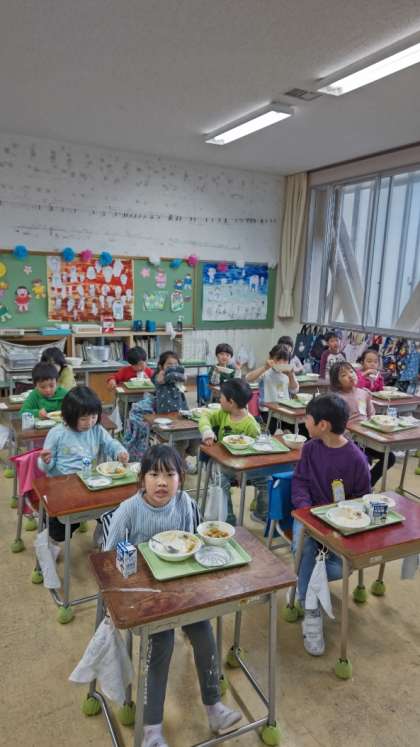 今日の給食は、お待ちかねの「カレーライス」です。ミートソースと並ぶ大人気定番メニューです。1年生はどうかな、と見に行きました。