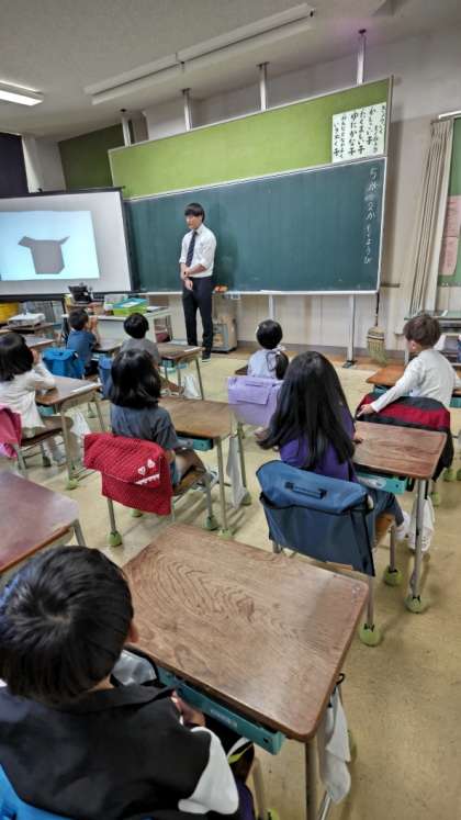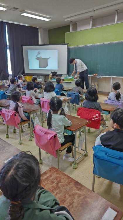 「かきとかぎ」の学習です。スクリーンに先生が不思議な箱を映し出しました。「かき」の絵を箱の中に入れたら「かぎ」の絵が出てきたよ。
