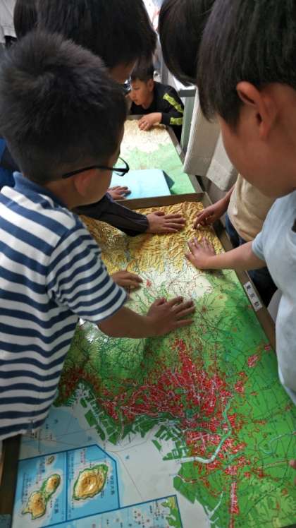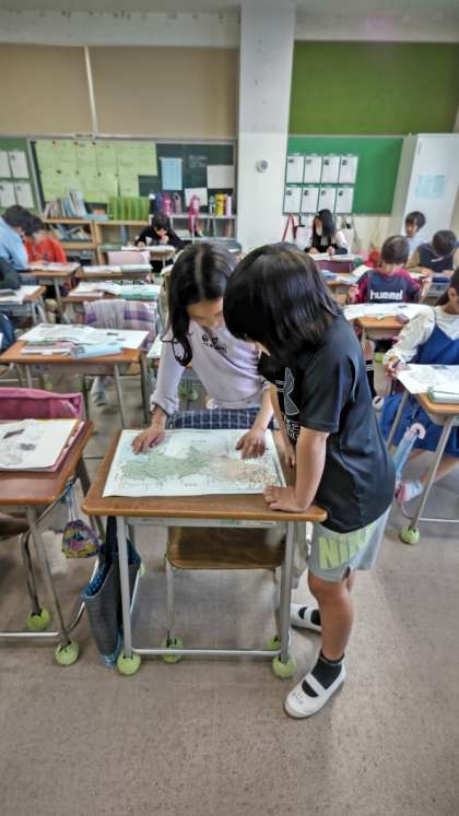 「わたしたちの東京都」の学習です。23区や26市をプリントで確認したり、立体地図を触ったりしています。