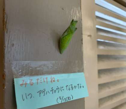 メダカは毎日のように卵を水草に産みつけています。休み時間にはメダカを見に来る子ども達もいて、卵を見つけては、「卵があったよ!」と孵化用の水槽に移してくれます。アゲハチョウの幼虫は先週末にさなぎになりました。幼虫は3匹いたのですが、そのうちの1匹はおしりの方からだんだん黒くなっていき、途中で動かなくなってしまいました。残念なことですが、自然の厳しさを感じました。無事にアゲハチョウになれますように。ホウセンカの種は発芽しました。もう少し大きくなったら鉢に植え替えます。