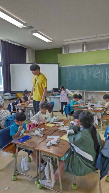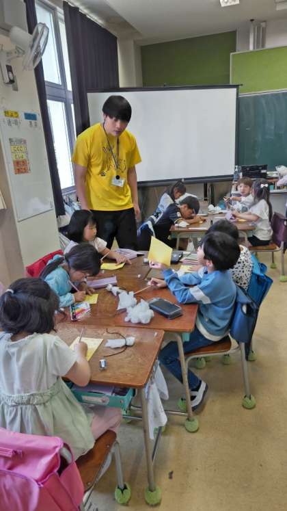 1年生がてるてる坊主を作っています。かわいいてるてる坊主が机の上に並んでいます。どうやらメッセージカードも書いています。