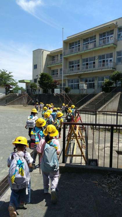 学校に到着しました。帰りはものすごく日差しが強くなったので、さすがの子どもたちも疲れた様子を見せています。