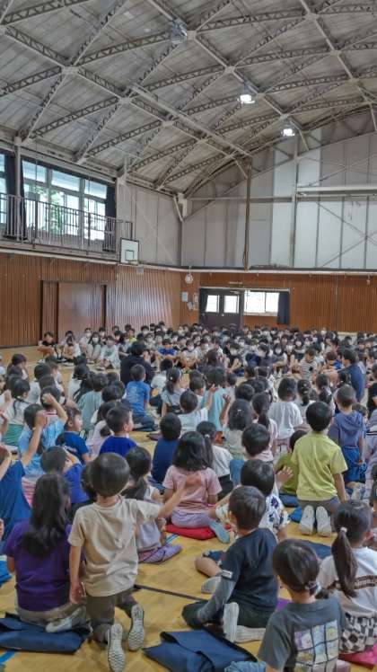 6月の生活目標のお話を聞いたあとで、来週いよいよ移動教室に出かける6年生に、5年生以下みんなで「いってらっしゃーい!」をしました。6年生も「いってきまーす!」と元気なお返事でした。