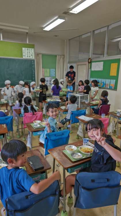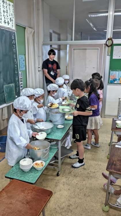 1年生の給食準備の様子です。今日は、みんなの大好きなスパゲティーミートソースとフルーツヨーグルトです!