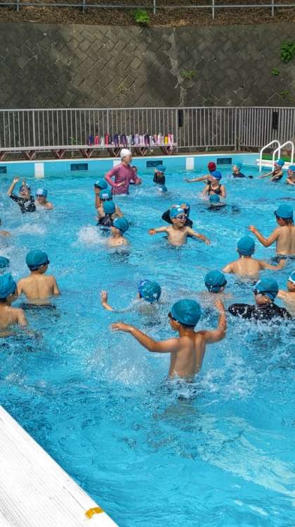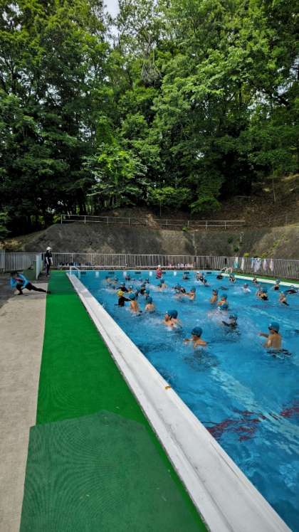 (小宮小のプールは、森に囲まれています)