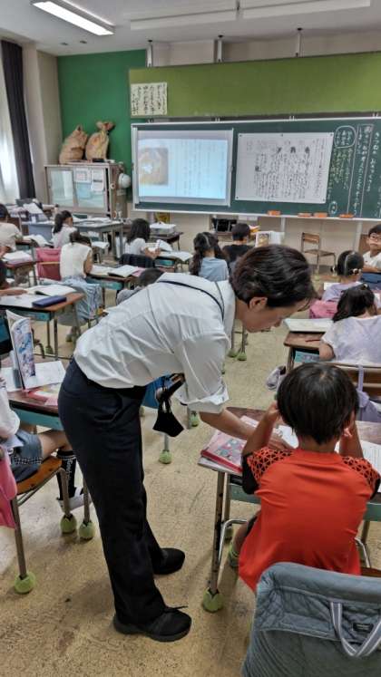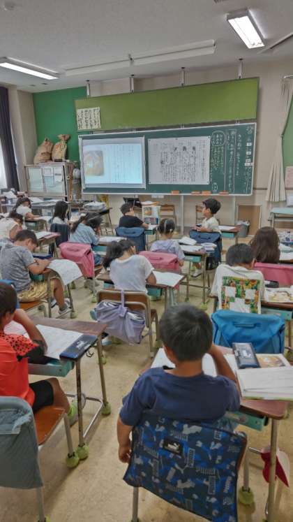 「きつねのおきゃくさま」の最終場面を読んでいます。ちょっと悲しい結末ですが、子供たちはきつねの心情をしっかり読み取ろうとしています。