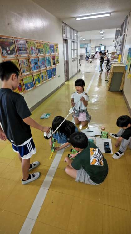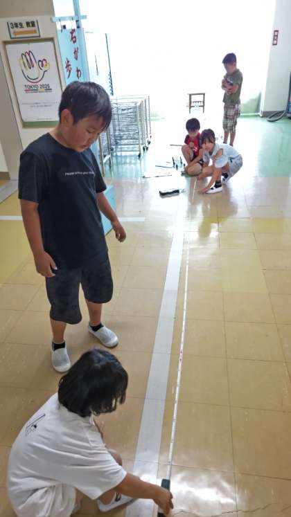 校長室前の廊下から楽しそうな声が聞こえてきました。3年生が理科の実験をしています。「風やゴムのはたらき」の学習です。