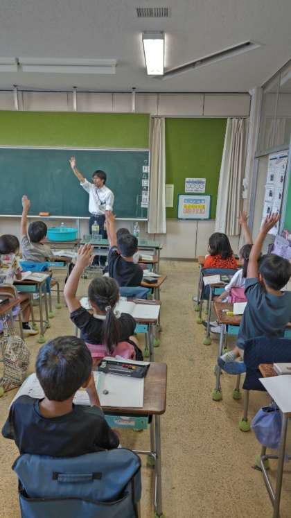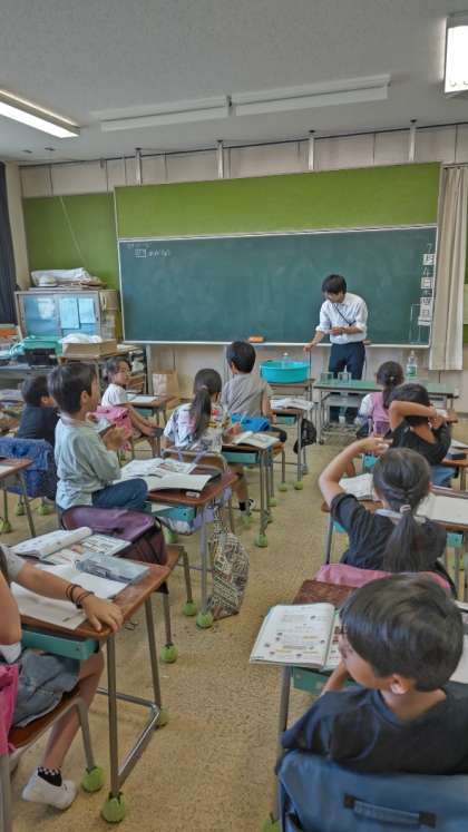 「かさ」の学習です。先生が「お茶」「サイダー」「しょうゆ」のペットボトルを用意しています。かさくらべをするようです。