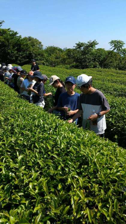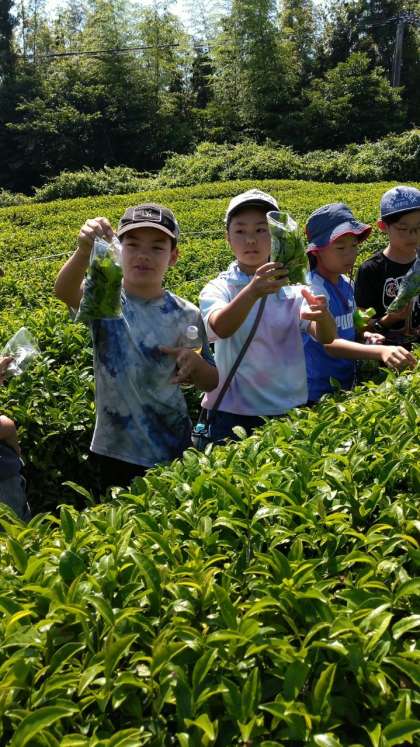 お茶会館では、茶摘み、茶もみ、茶飲みをクラスごとに交代で体験しました。薄い黄緑色の若い葉をプチッと摘むとなんだか楽しい気分になりますね(*^^*)