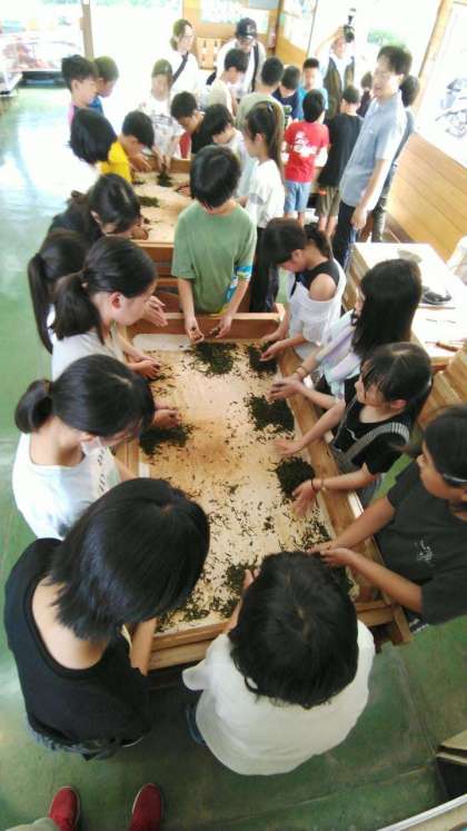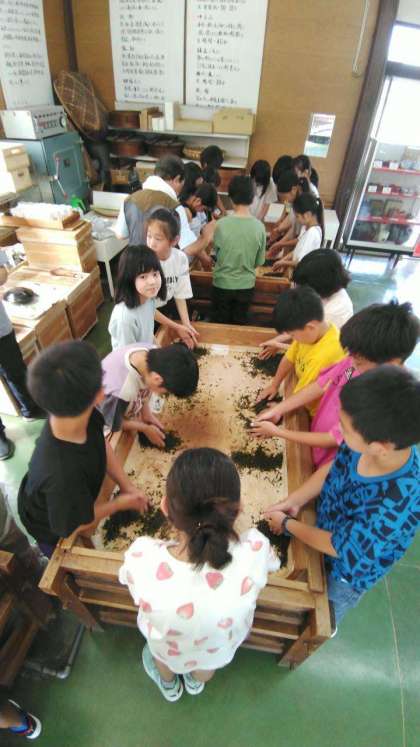 お茶の葉を温めながらもむ…みんなが体験した中もみは手作業の工程では40分間続けるようです(・・;)今日は10分もしていないような…。手作業での茶もみの大変さを感じました!