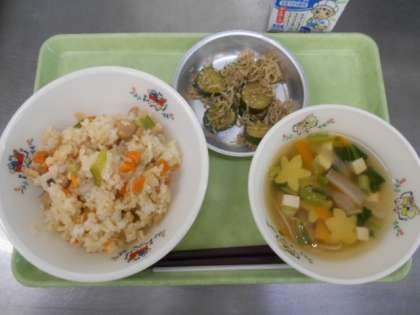 七夕汁には天の川に見立てたそうめん、星型のかまぼこ、短冊の形をした野菜など七夕感満載の給食です。