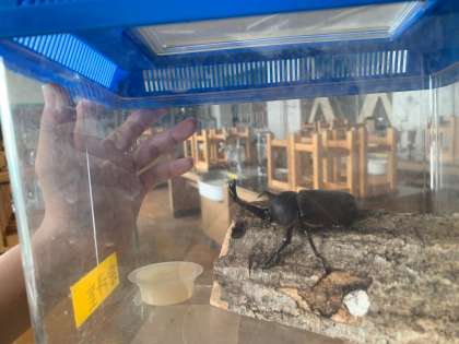 「理科室に虫かごはありますか?」と今朝も子どもたちがやって来ました。今週は毎日日替わりでいろんな生き物を見せに来てくれます。虹色トカゲ(子ども達は、「ニホントカゲのことだよ」と教えてくれました。)やタマムシ、立派なつのをもったカブトムシ、コクワガタなど。子ども達は、まるで「かわいいでしょ?」と言いたげな様子です。使っていない虫かごを貸し出す時に「えさは、ある? 何がえさか、知ってる?」と会話をした後、子ども達は「草を取りに行こう。」「土も入れよう。」とその生き物がいた場所の様子を思い出しながら校庭に走って行きました。