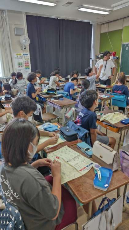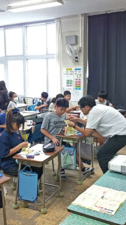 5年生も家庭科です。こちらは裁縫をしています。「手縫い練習布」に取り組んでいます。玉結び、玉止め・・・。